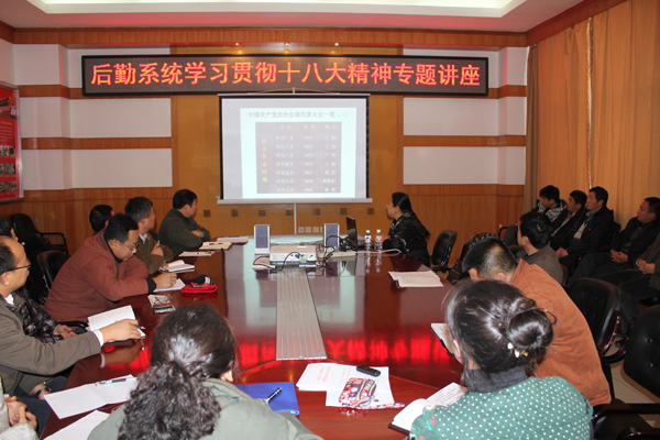 为深入学习领会党的十八大精神,进一步增强后勤广大职工的政治意识、大局意识、责任意识,11月16日下午,后勤党总支举办“学习贯彻党的十八大精神”专题讲座,邀请思想政治理论课教学科研部副教授陈立媛博士主讲。会议由后勤党总支书记王祖华主持,后勤服务总公司总经理张晓宇、总务处处长戴广仁及总公司、总务处和基建处等部门负责人、全体党员和管理人员参加了学习。